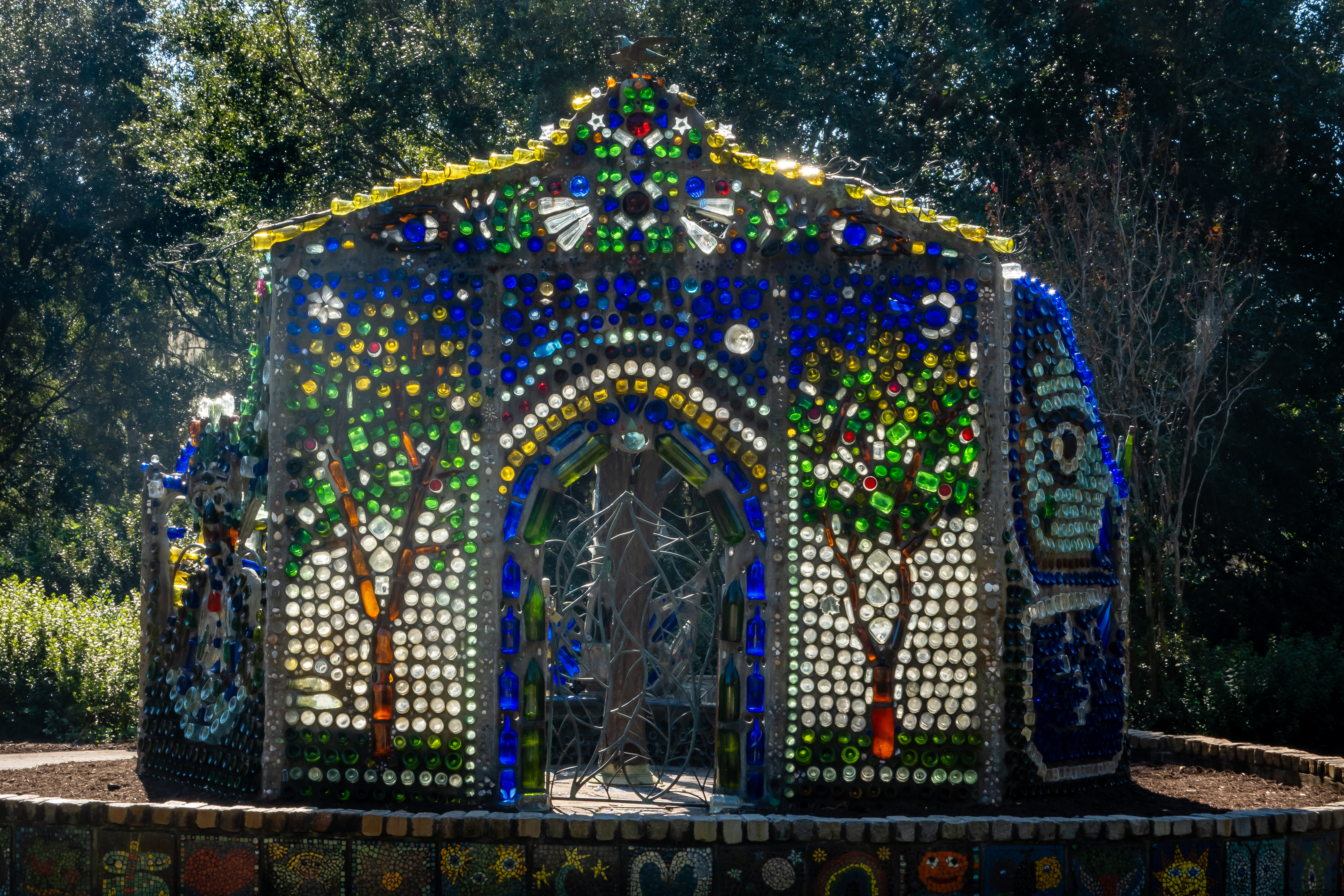 The butterfly house was technically open, it it was being used for a holiday light display so no butterflies were present. There was one other unique building that constructed in 2004. The Bottle Chapel is made of a few hundred glass bottles of various colors. A couple of trees and a huge butterfly were part of the design. The sunlight was shining just right to highlight the colors. I bet this looks remarkable at night during the holiday light show.